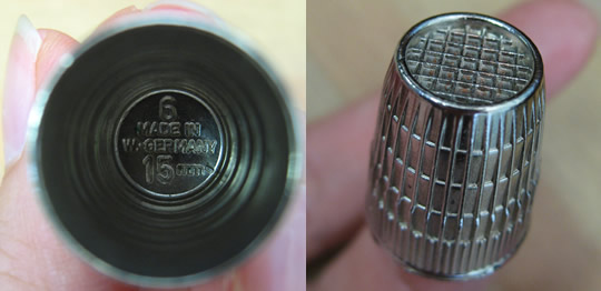 キルティングに欠かせないシンブル パッチワークはいわゆる運針と同じなので 和裁などで縫い慣れた方は 針も指貫きも ご自分の使いやすいものにされても構わないと思いますが キルティングだけは 絶対 シンブル(キャップ型指貫き)が必要です 初めは 慣れないのでとても使いにくく 諦めそうになりますが ベビーキルト一枚作るころには シンブルがないとキルト出来なくなってるはずです シンブルが あるのと無いのとでは 正確さも スピードも大きく違います どうぞご自分に合った シンブルと針をみつけて下さい もっともっとキルトが楽しくなります 画像は私が一番使いやすい MADE IN W.GERMANY サイズ6(15mm) 一時 日本からこの型が消えてしまって困ったことがあったので 何個か買い貯めてます 今でも W.GERMANY の表示はあるのかしら? |